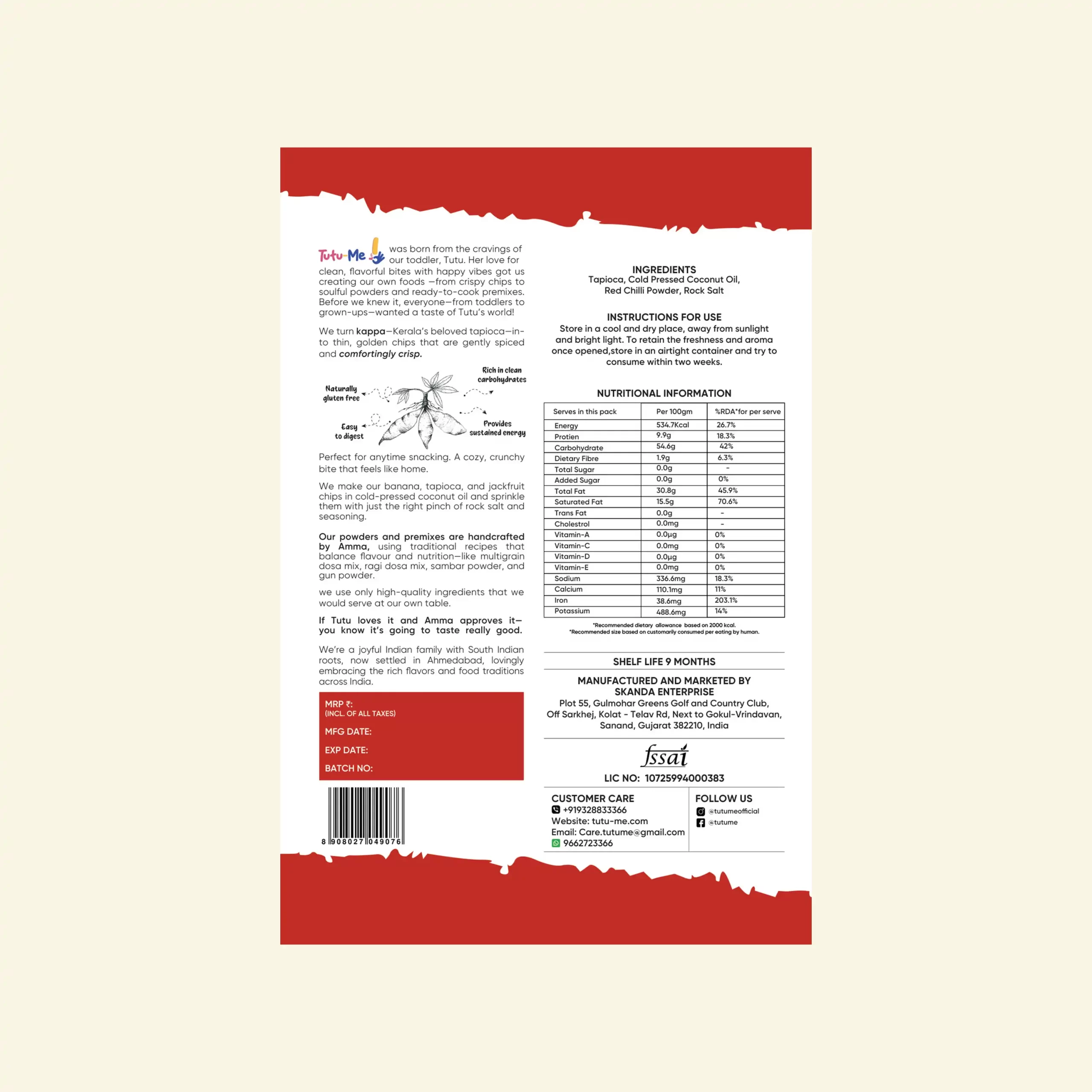 Tutu-Me chips are handmade in small batches using 100% cold-pressed coconut oil and traditional Kerala recipes. Our chips are vegan, gluten-free, zero trans-fat, zero cholesterol, preservative-free, and tested by NABL-accredited labs.