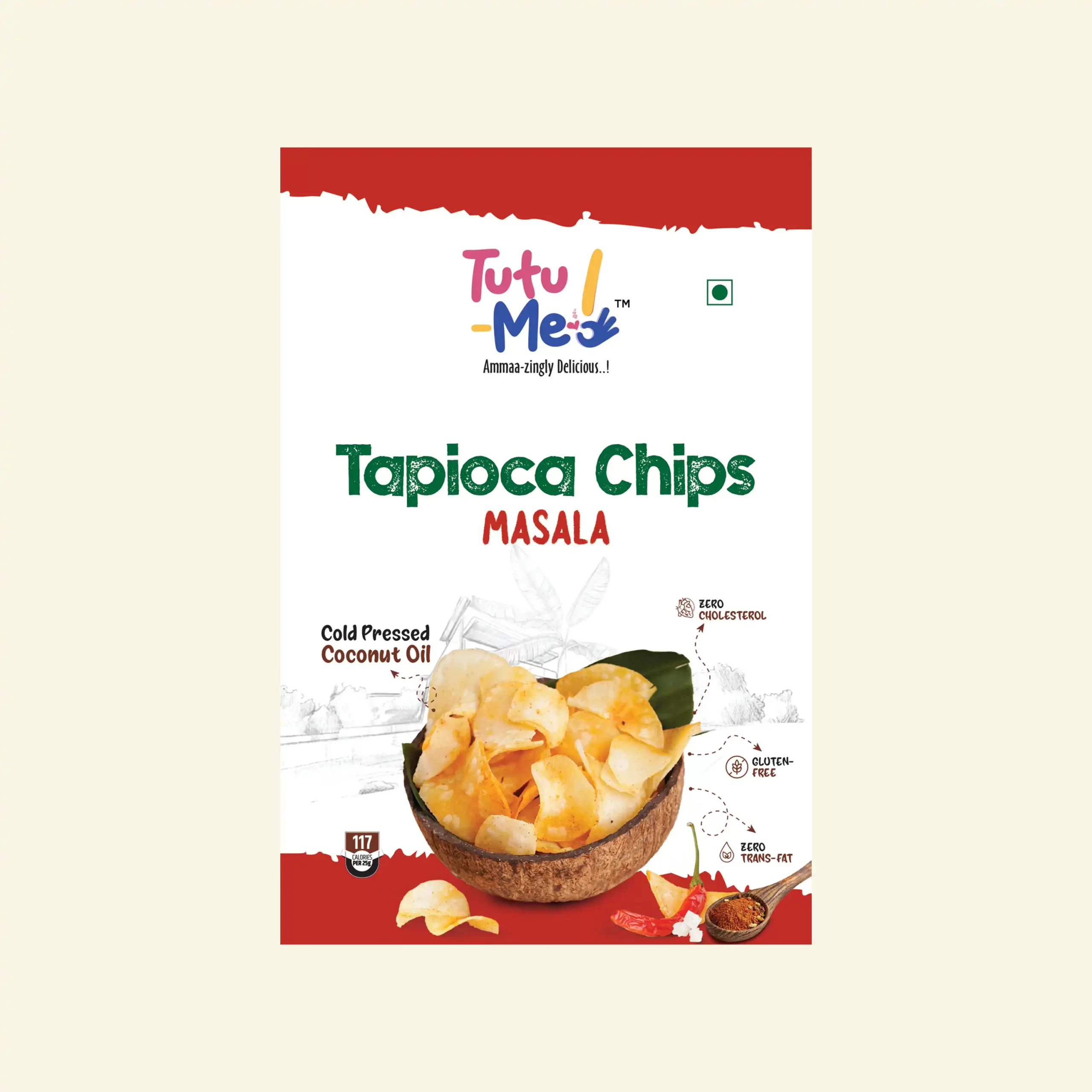 Our Masala Tapioca Chips bring together the natural crunch of tapioca with a flavorful blend of spices — all fried in cold-pressed coconut oil.