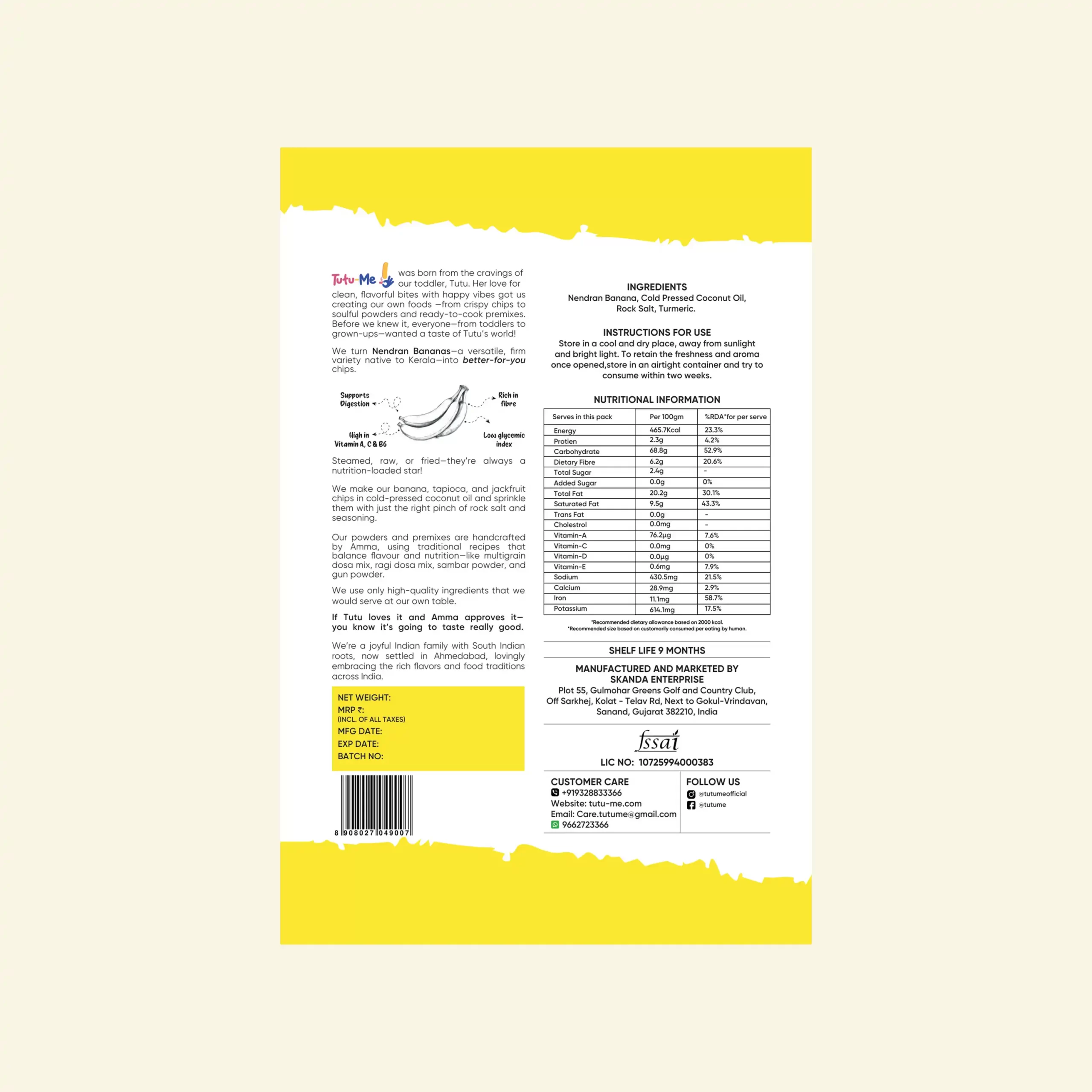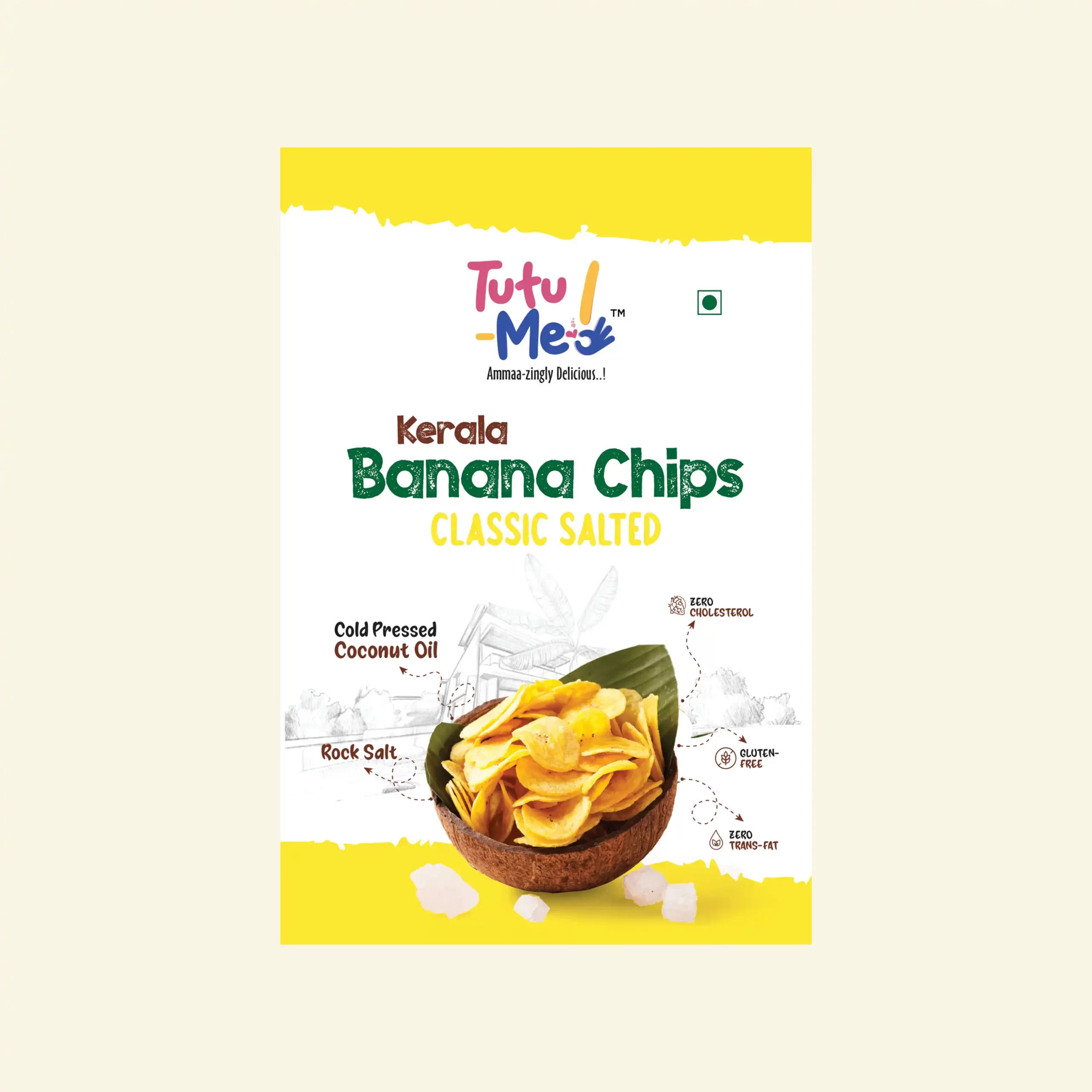 Tutu-Me chips are handmade in small batches using 100% cold-pressed coconut oil and traditional Kerala recipes. Our chips are vegan, gluten-free, zero trans-fat, zero cholesterol, preservative-free, and tested by NABL-accredited labs.